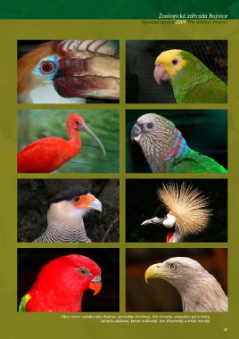Zoologická záhrada Bojnice Výročná správa 2009 The Annual Report Zľava zhora: zobákorožec Blythov, amazoňan žltohlavý, ibis červený, amazoňan golierikatý, karančo pásikavý, žeriav kráľovský, lori žltochrbtý a orliak morský. 47