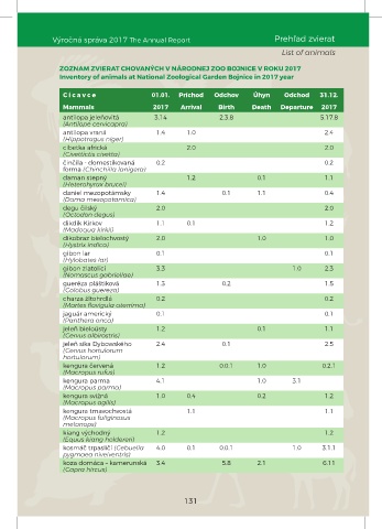 Výročná správa 2017 The Annual Report Prehľad zvierat